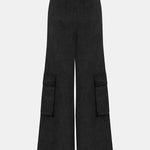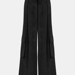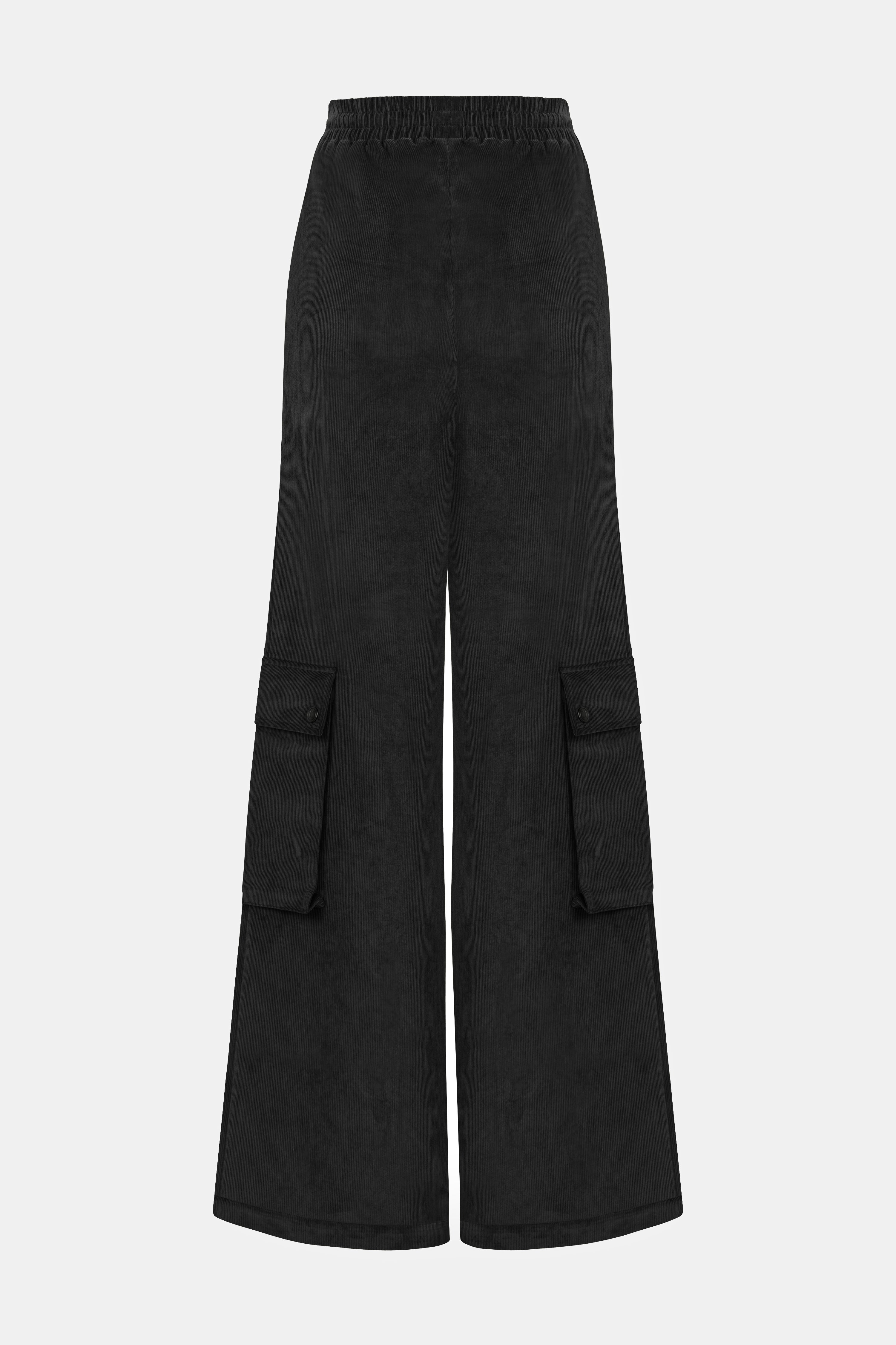 Wide-leg trousers made of velvet fabric with a drawstring waist and pocket details.