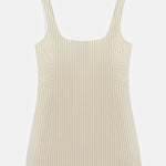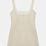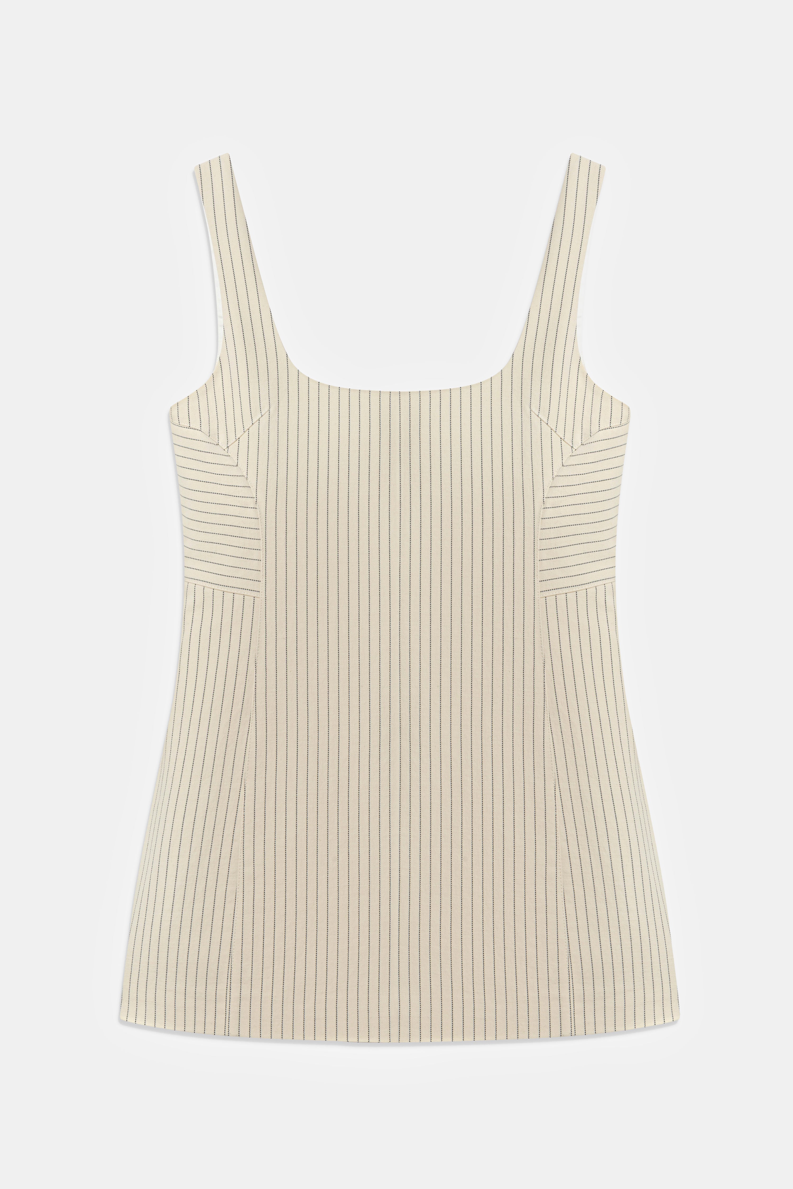 Square neck mini dress with thick straps and pinstripe pattern.