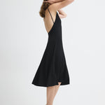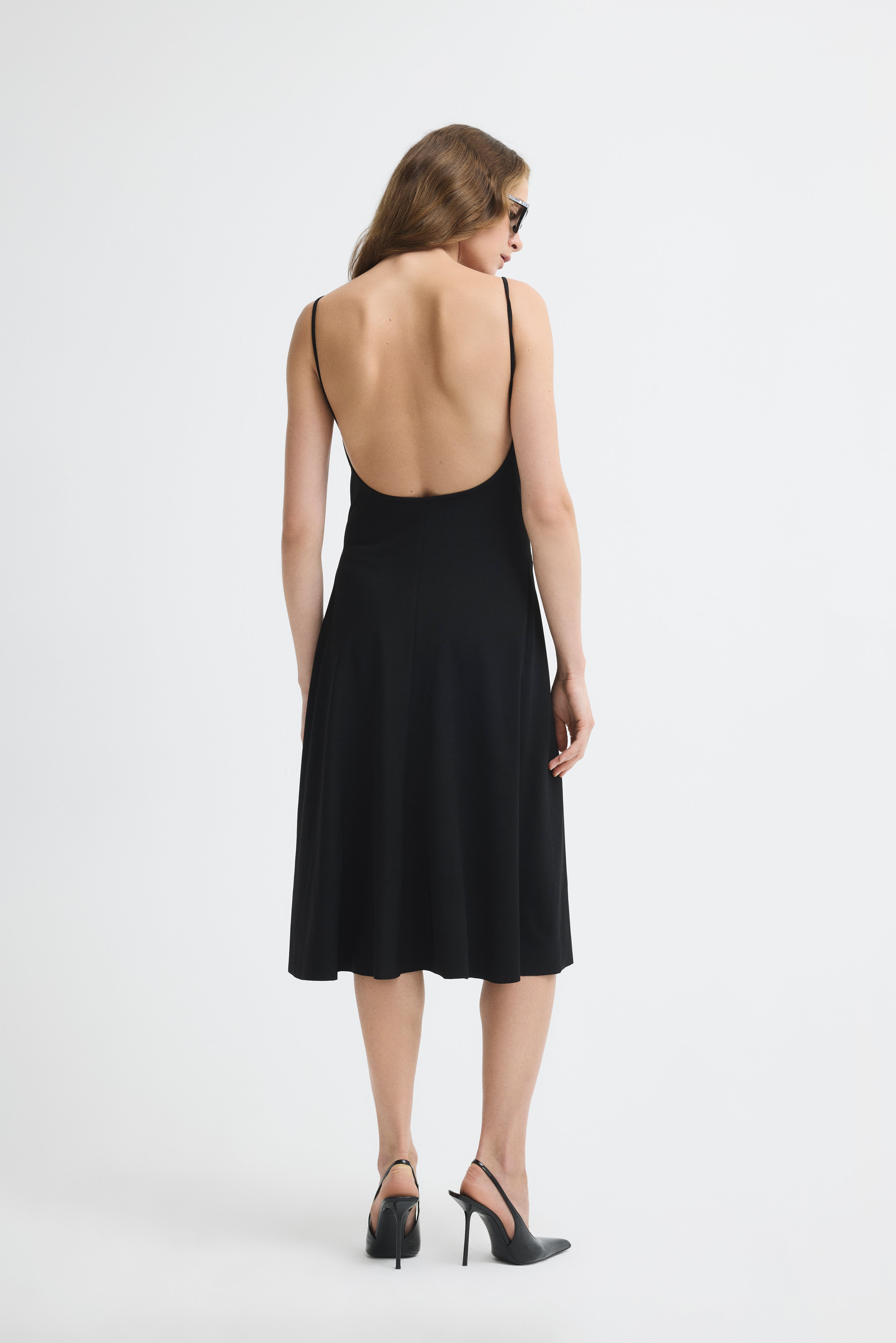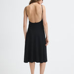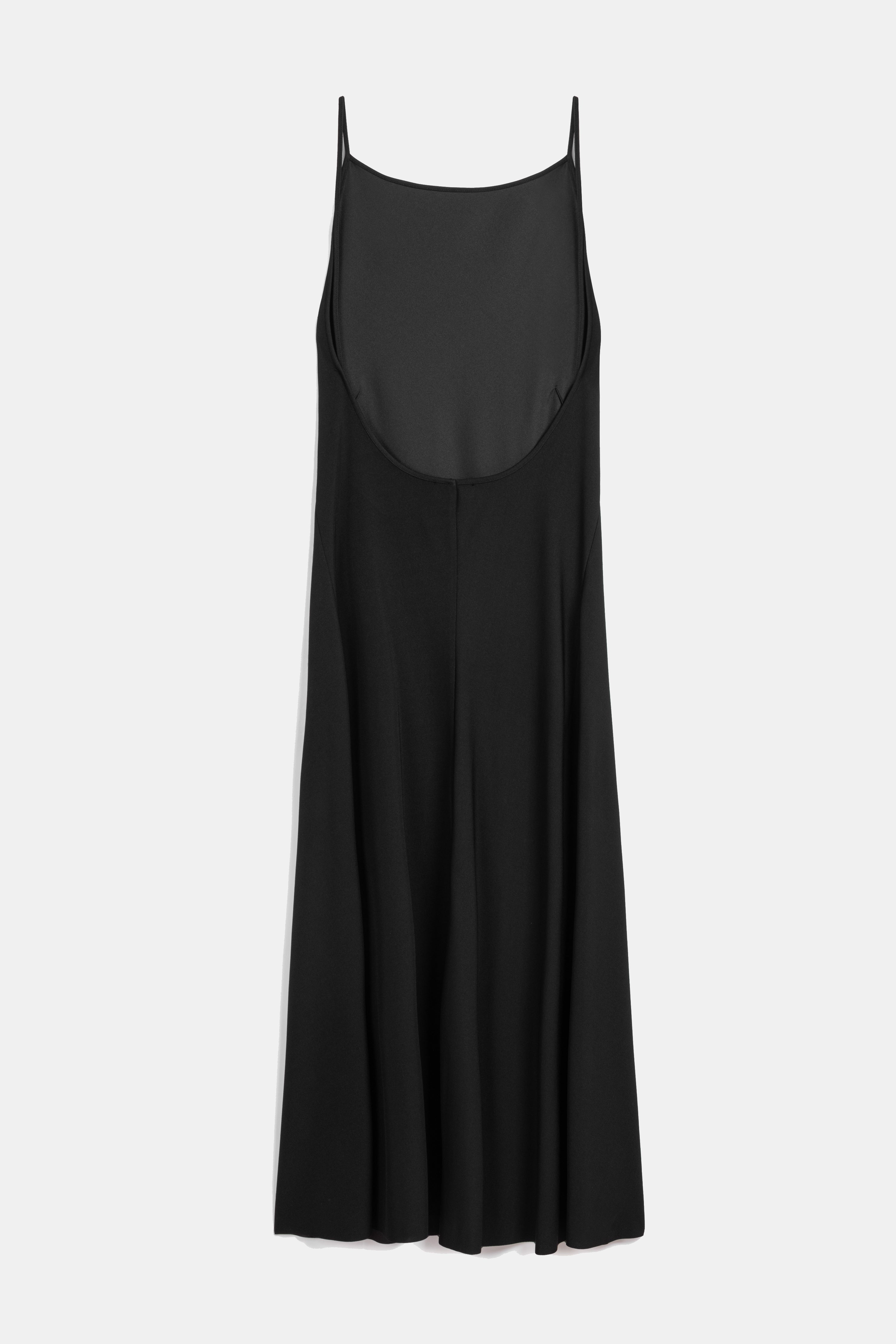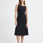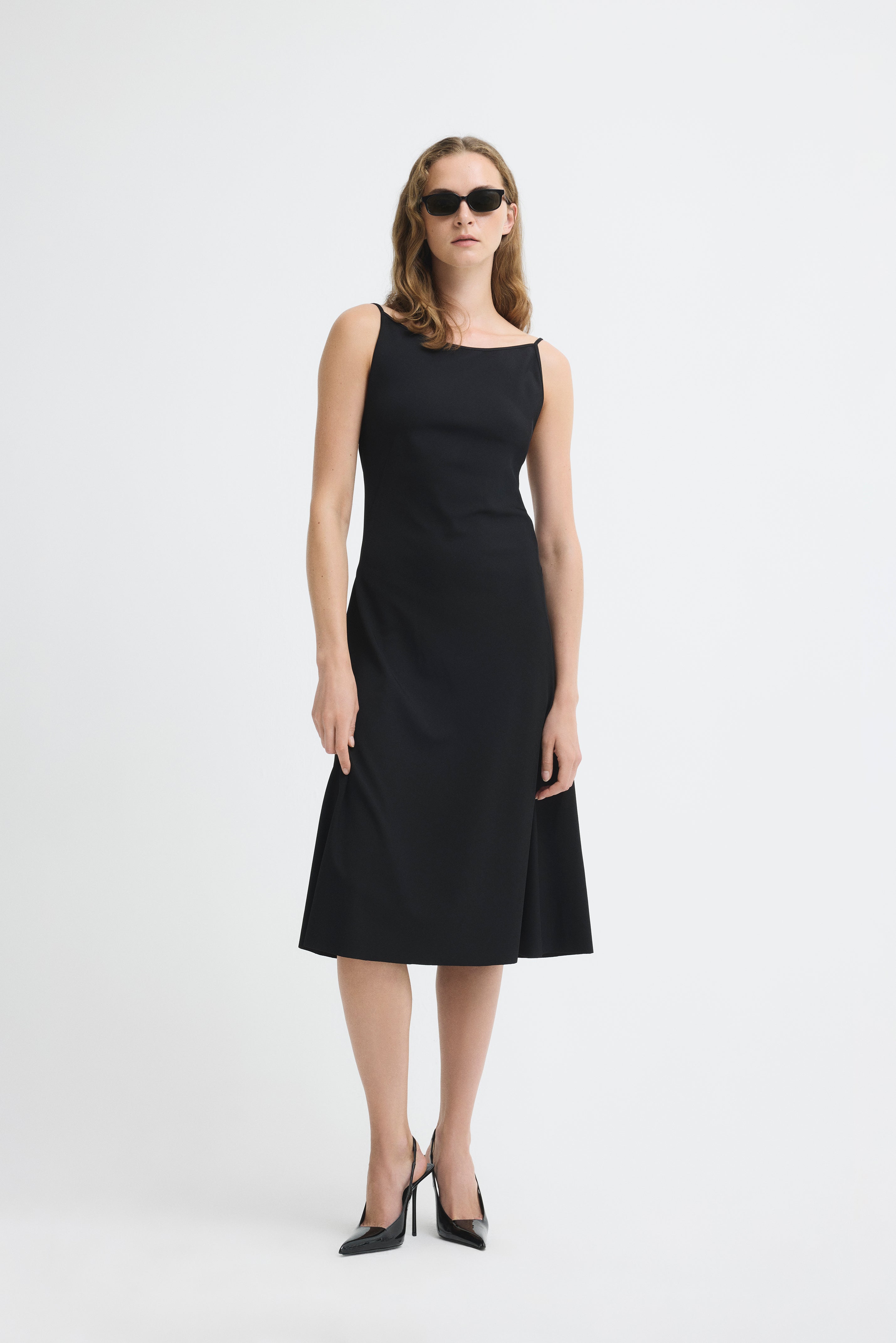 Black midi dress with bateau neckline and straps.