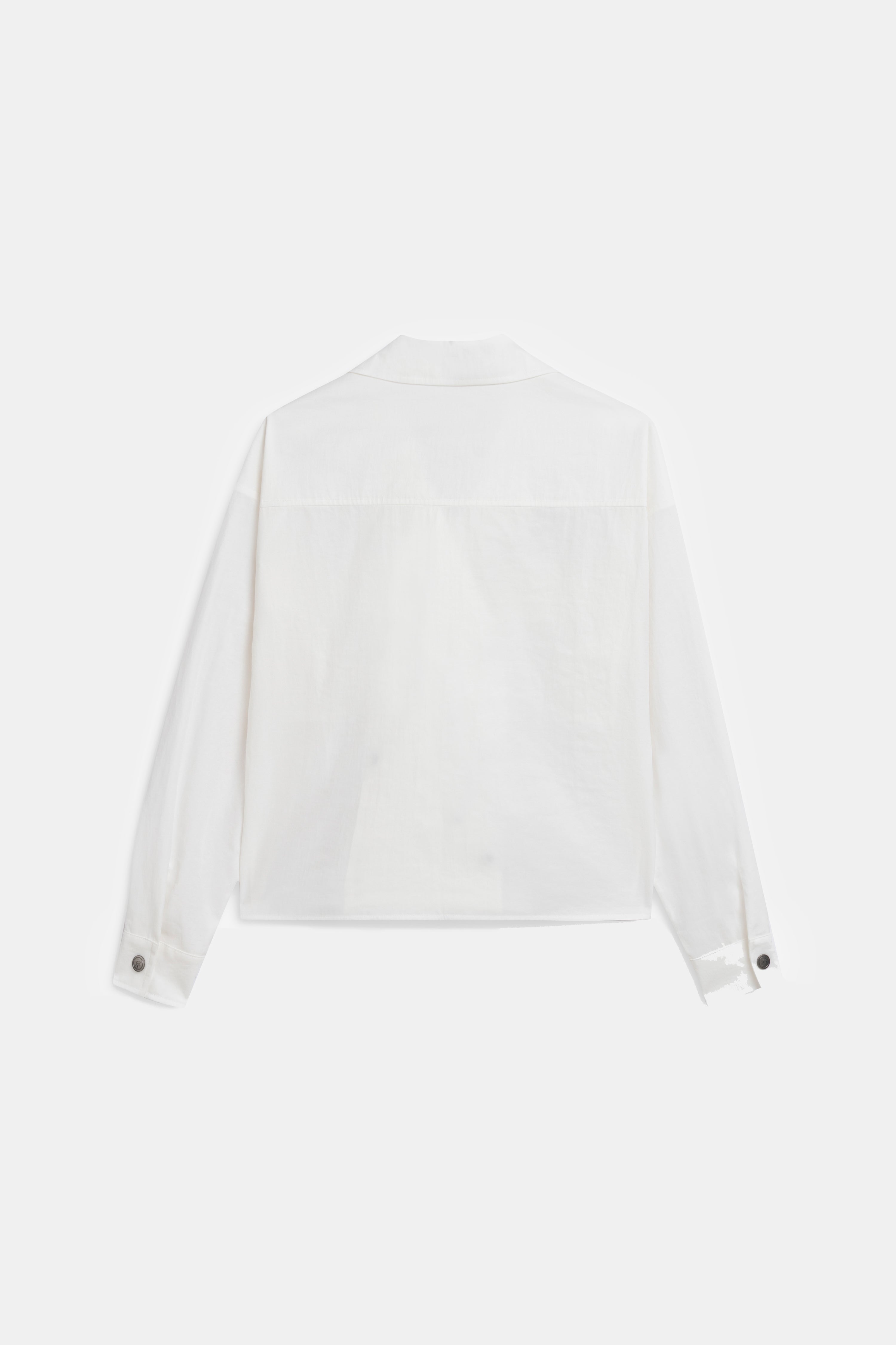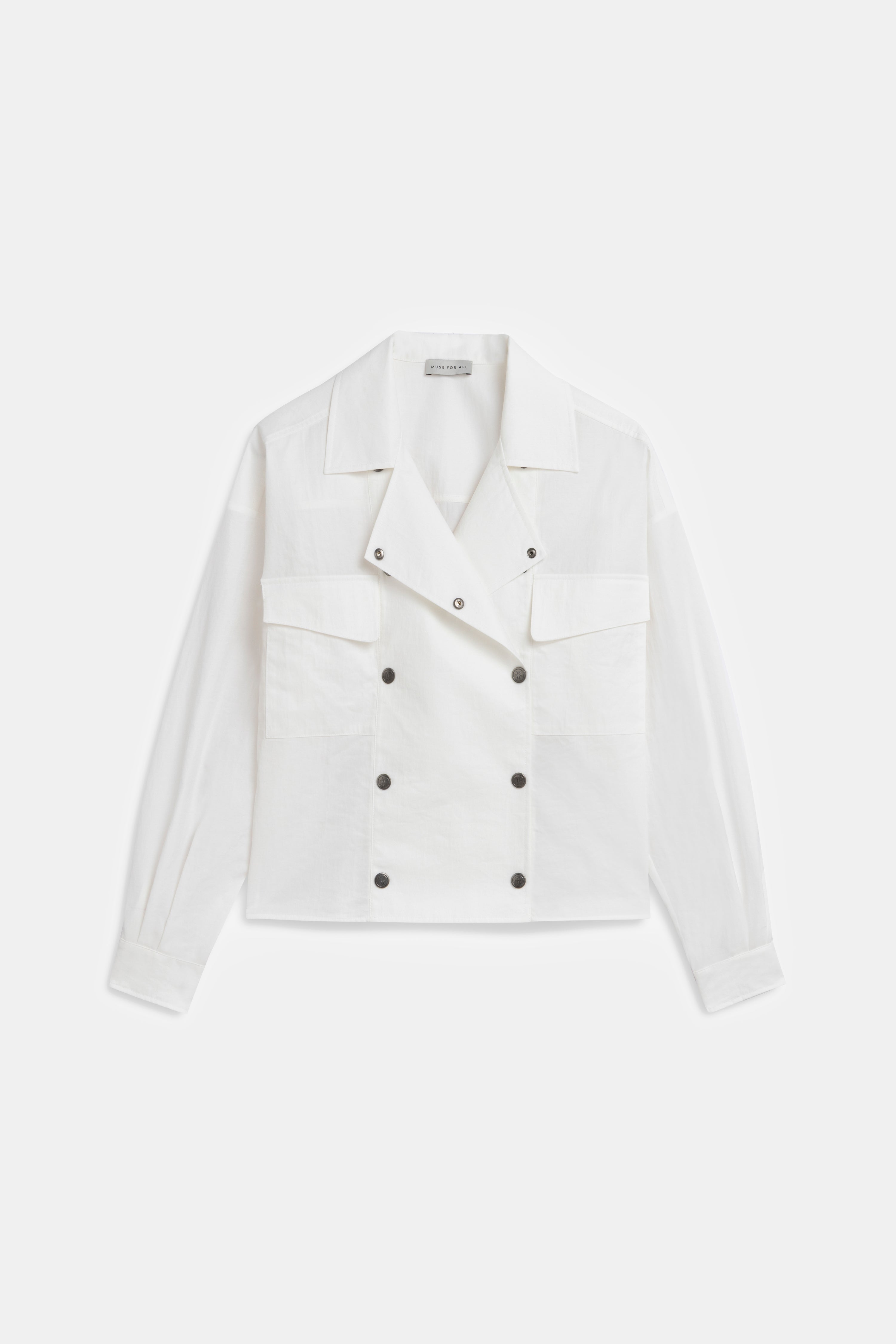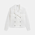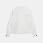 Double-breasted white shirt jacket with large pockets and a classic collar.