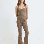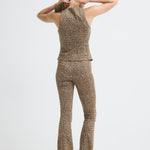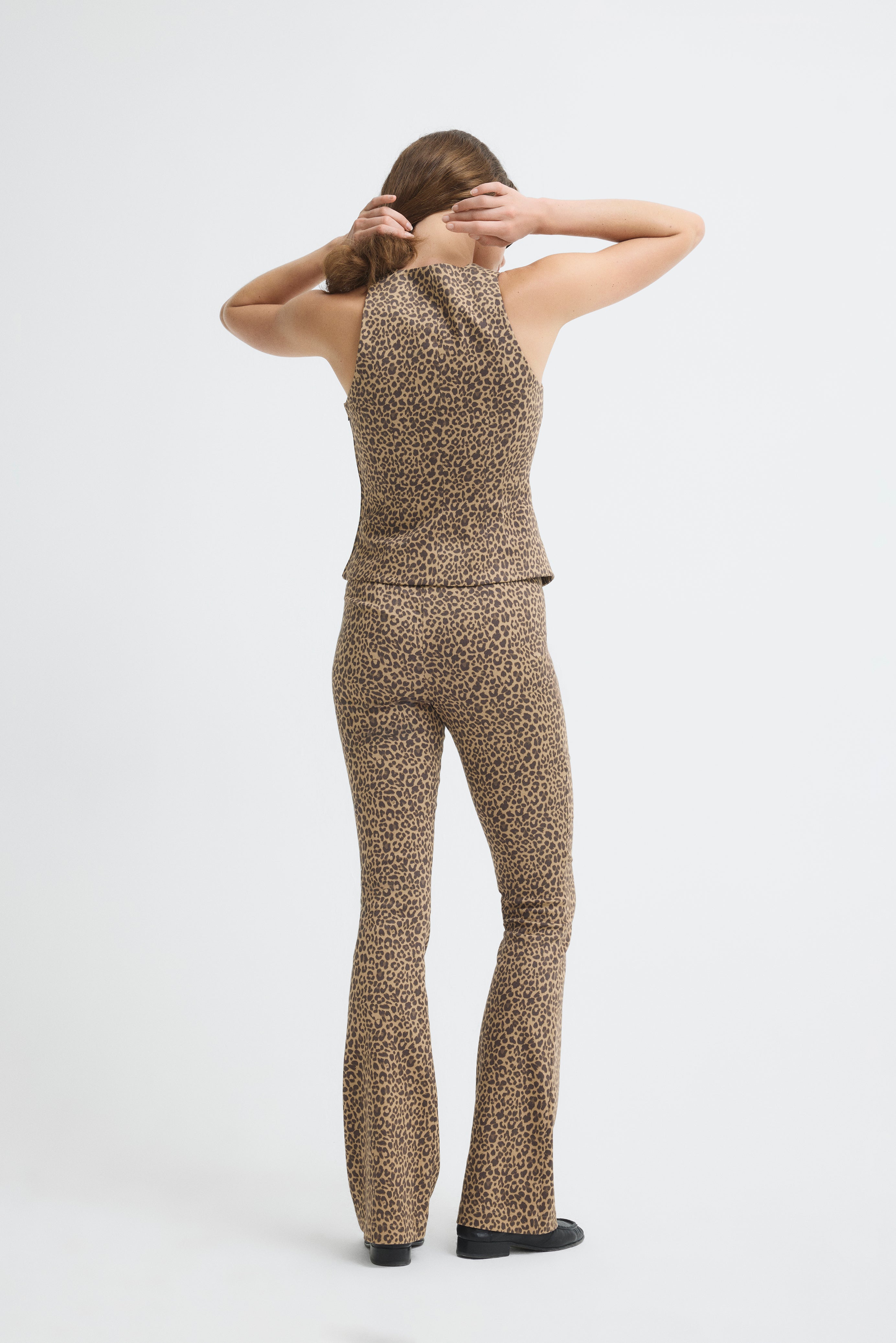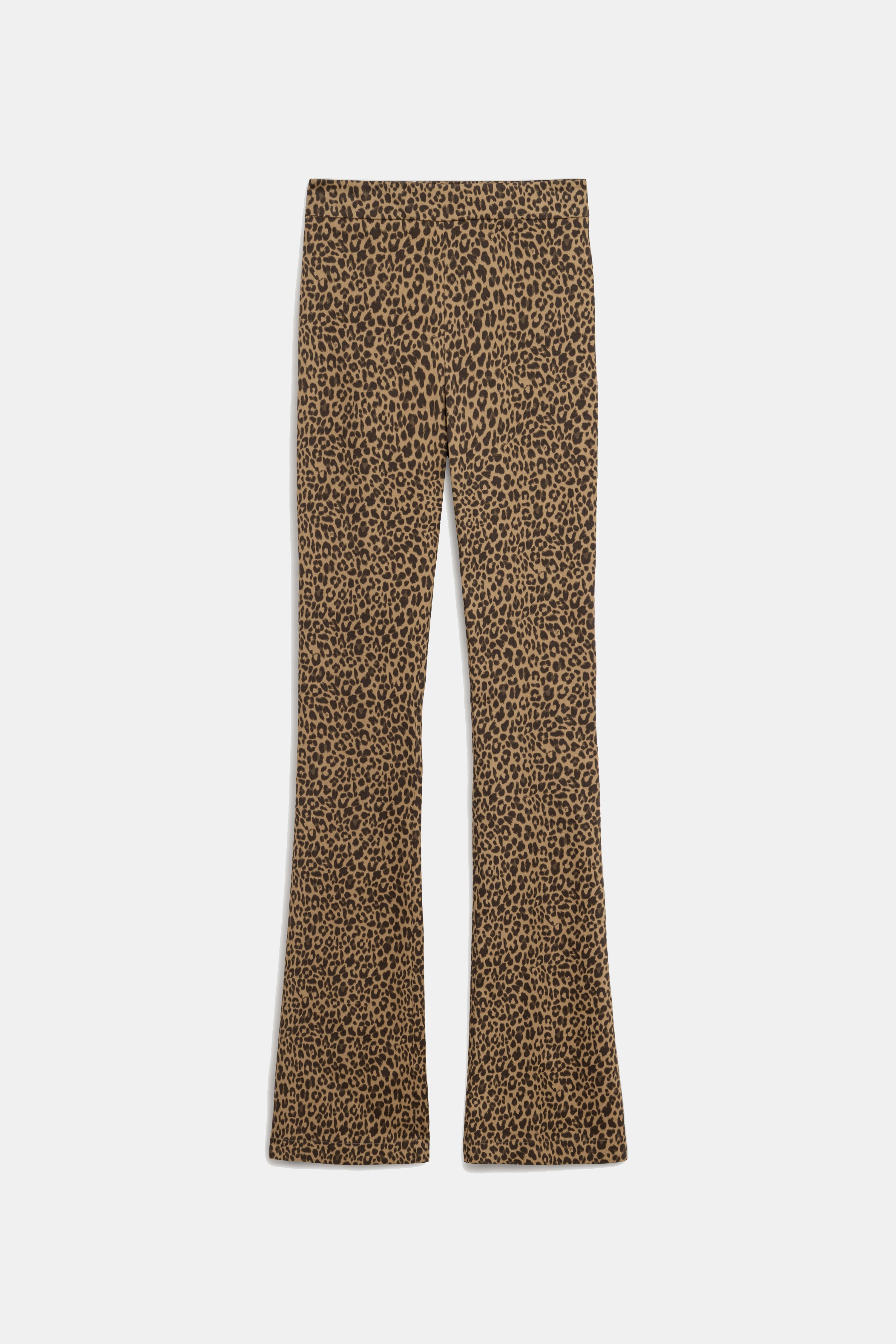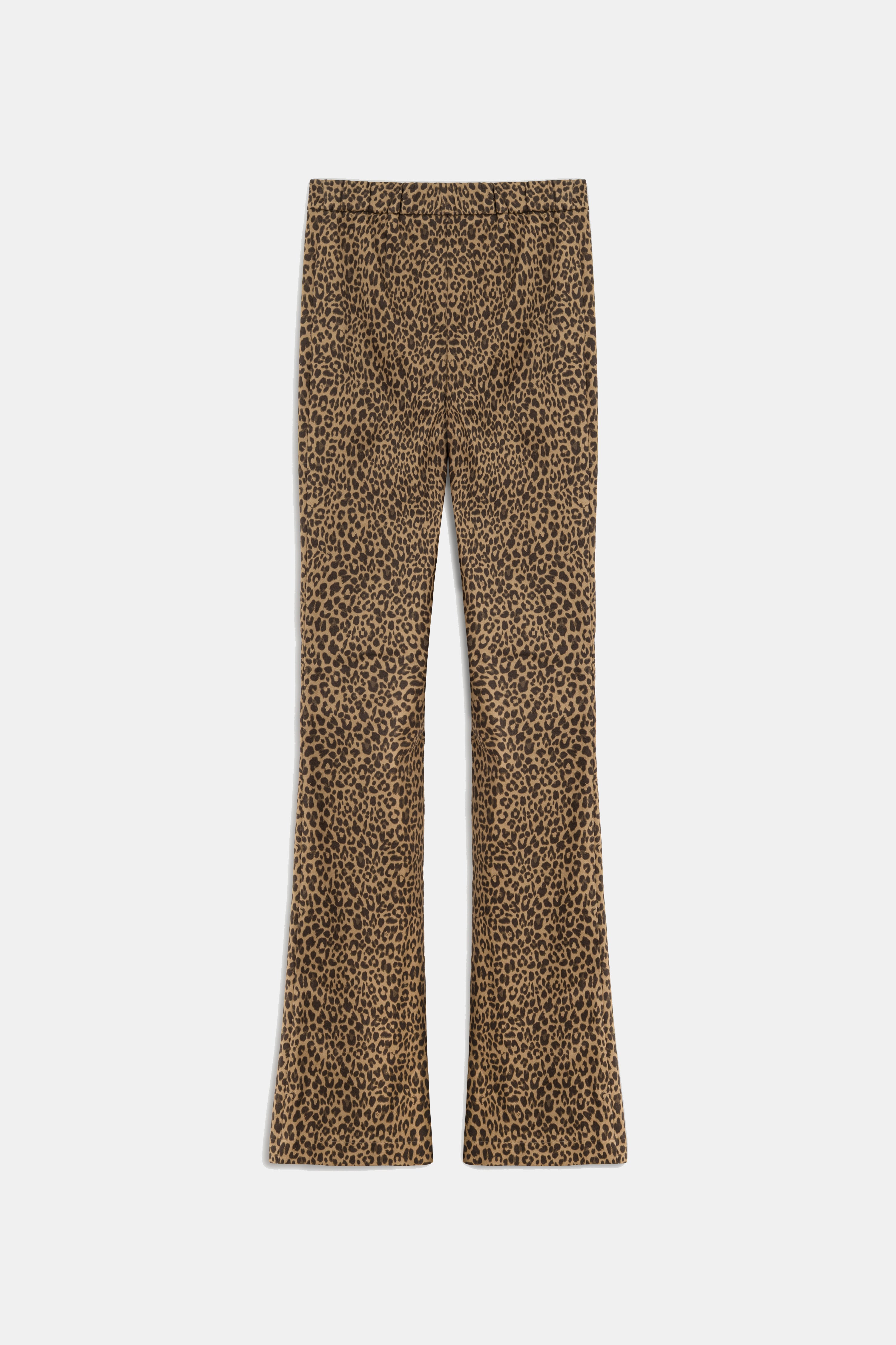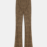 Leopard-printed pants with a fitted silhouette and flared legs.