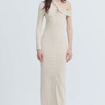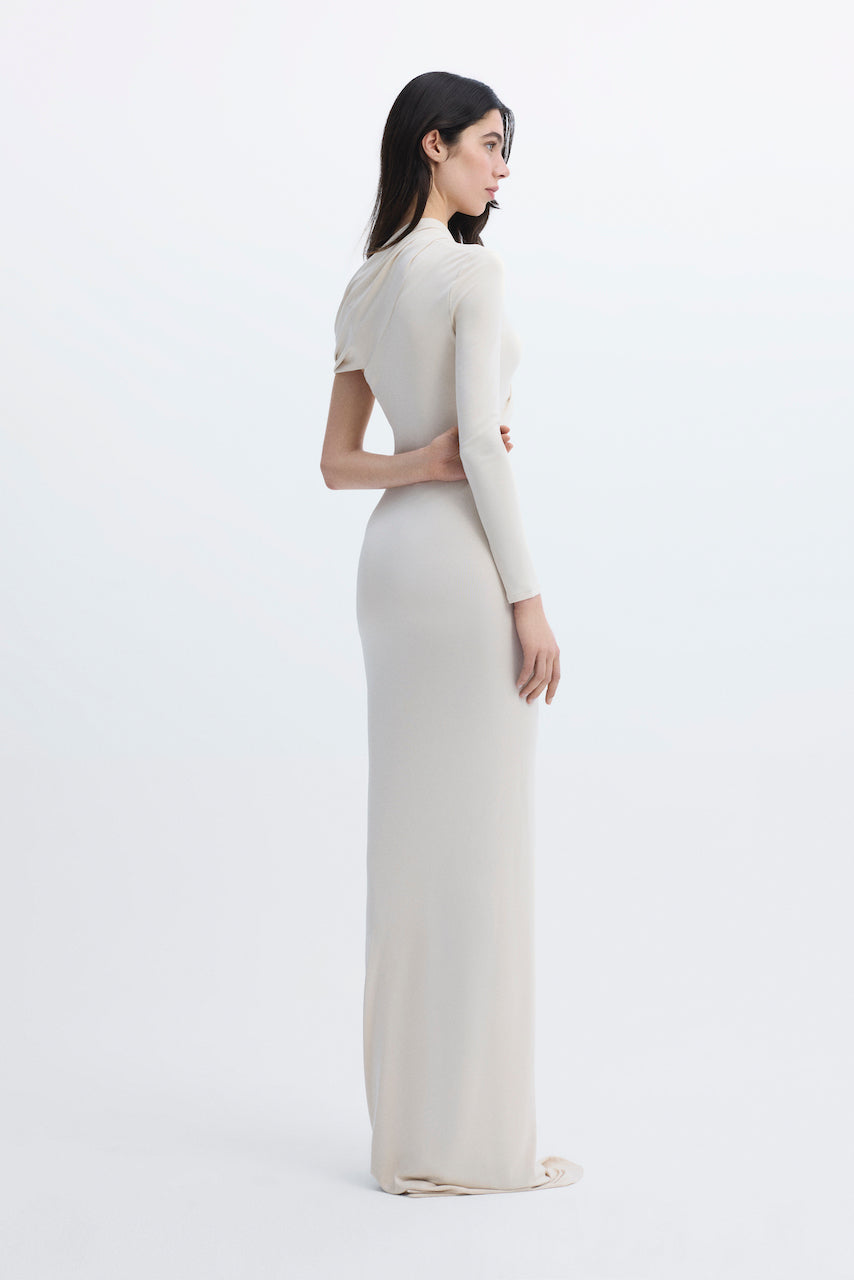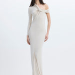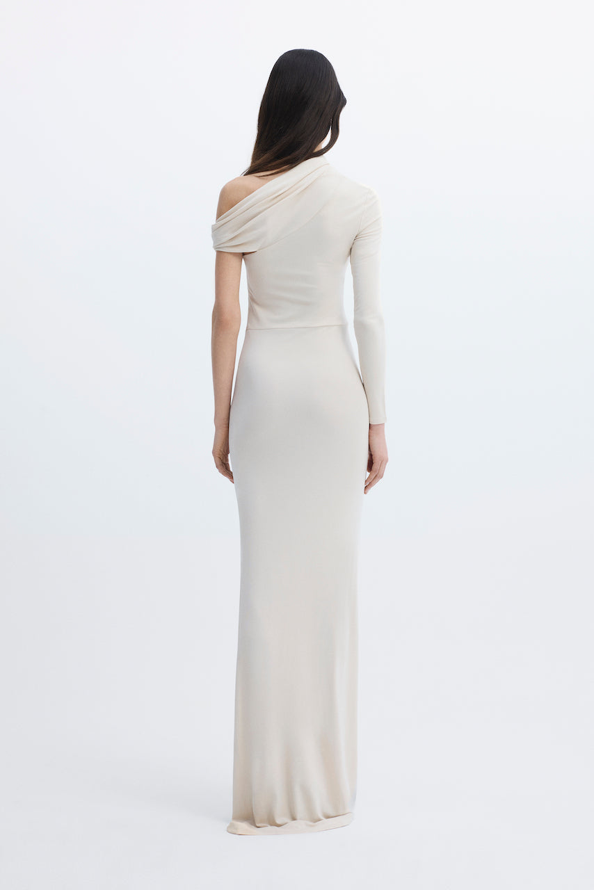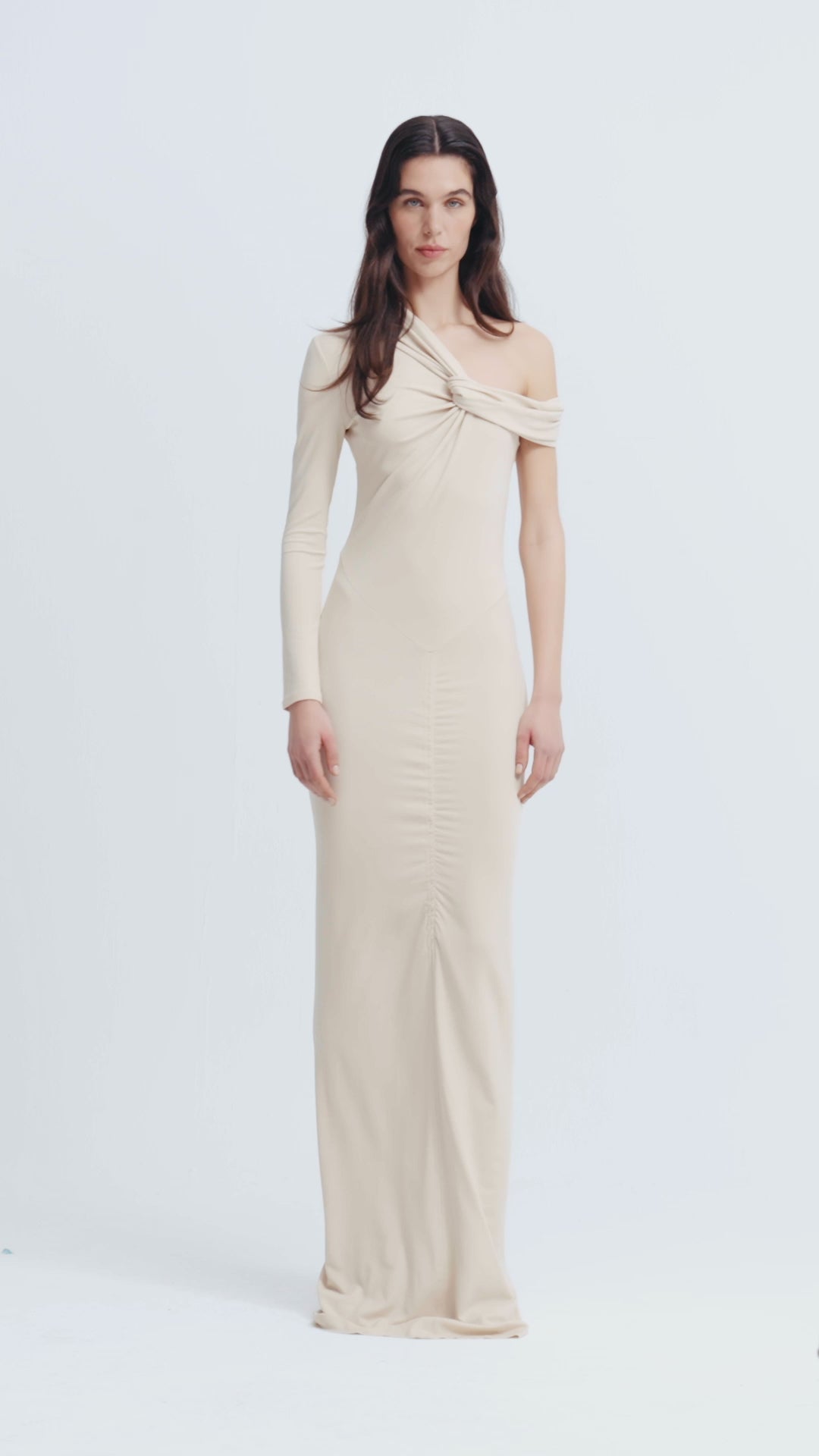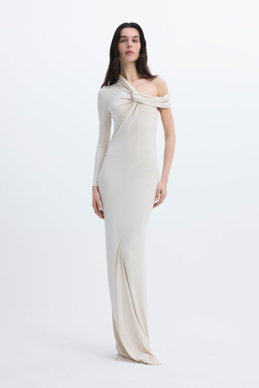 One-shoulder, draped and ruched long dress.
