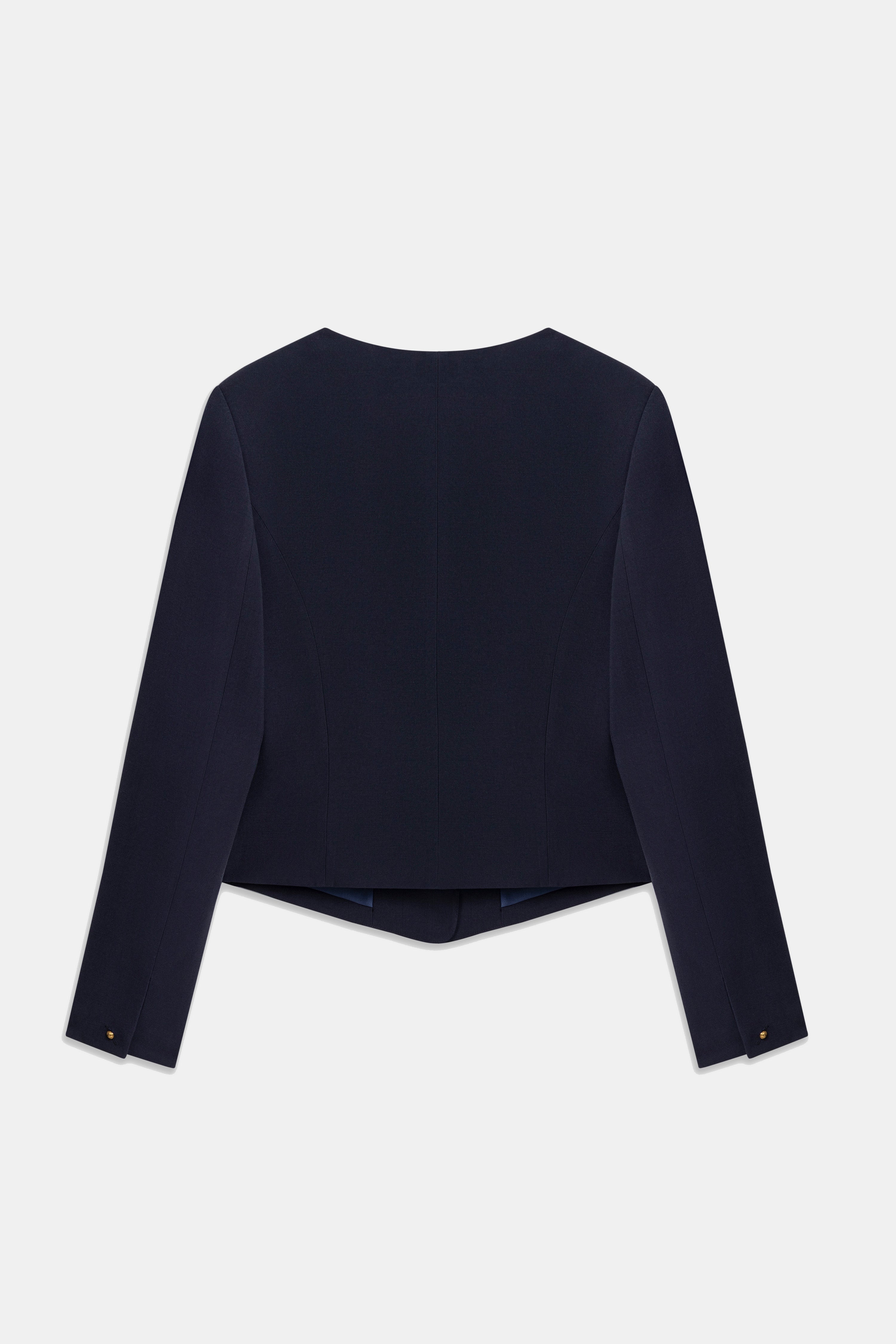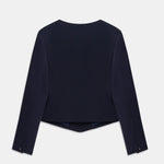 Square neck, short navy blue jacket with gold button details.