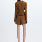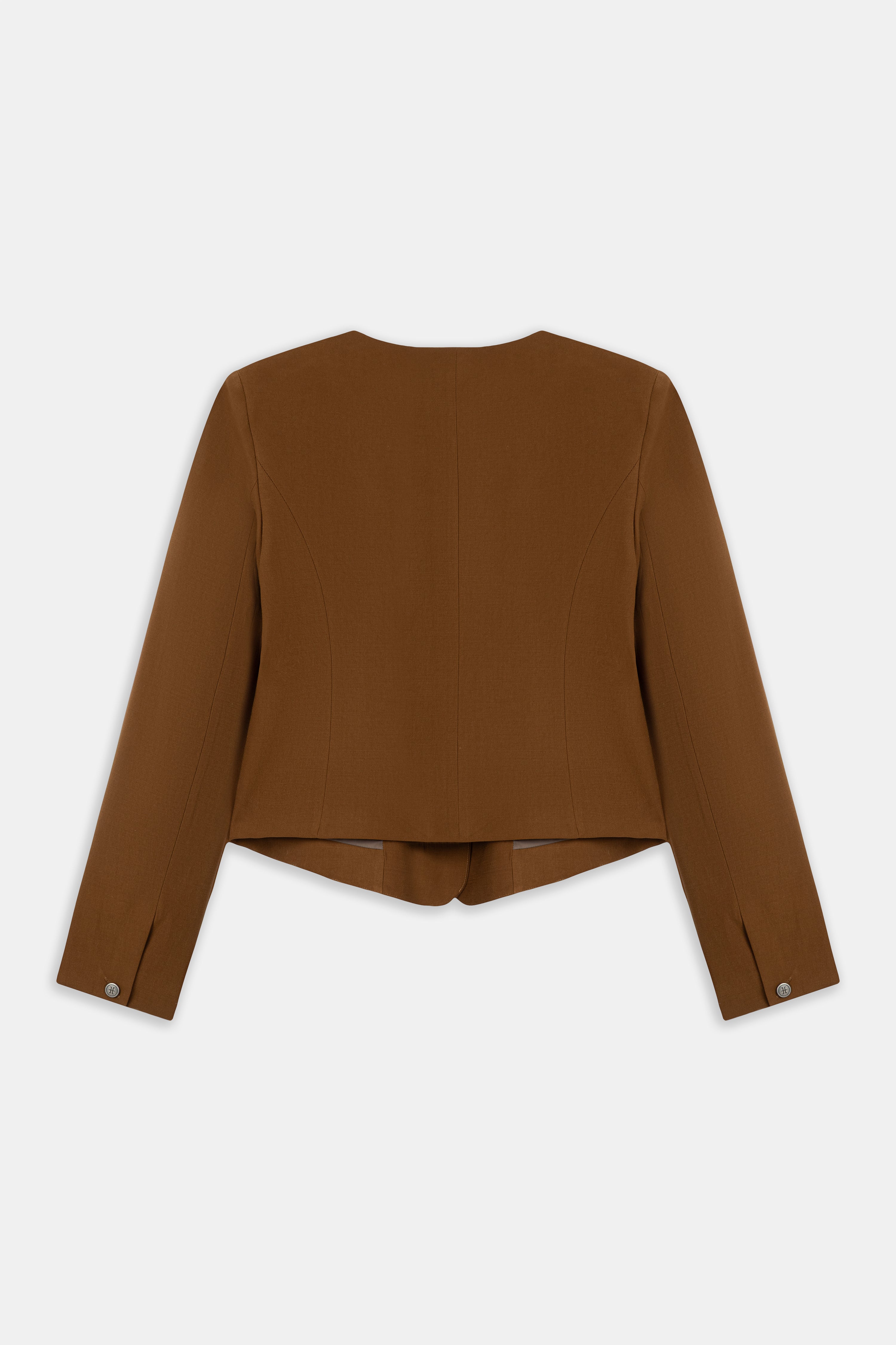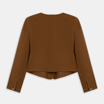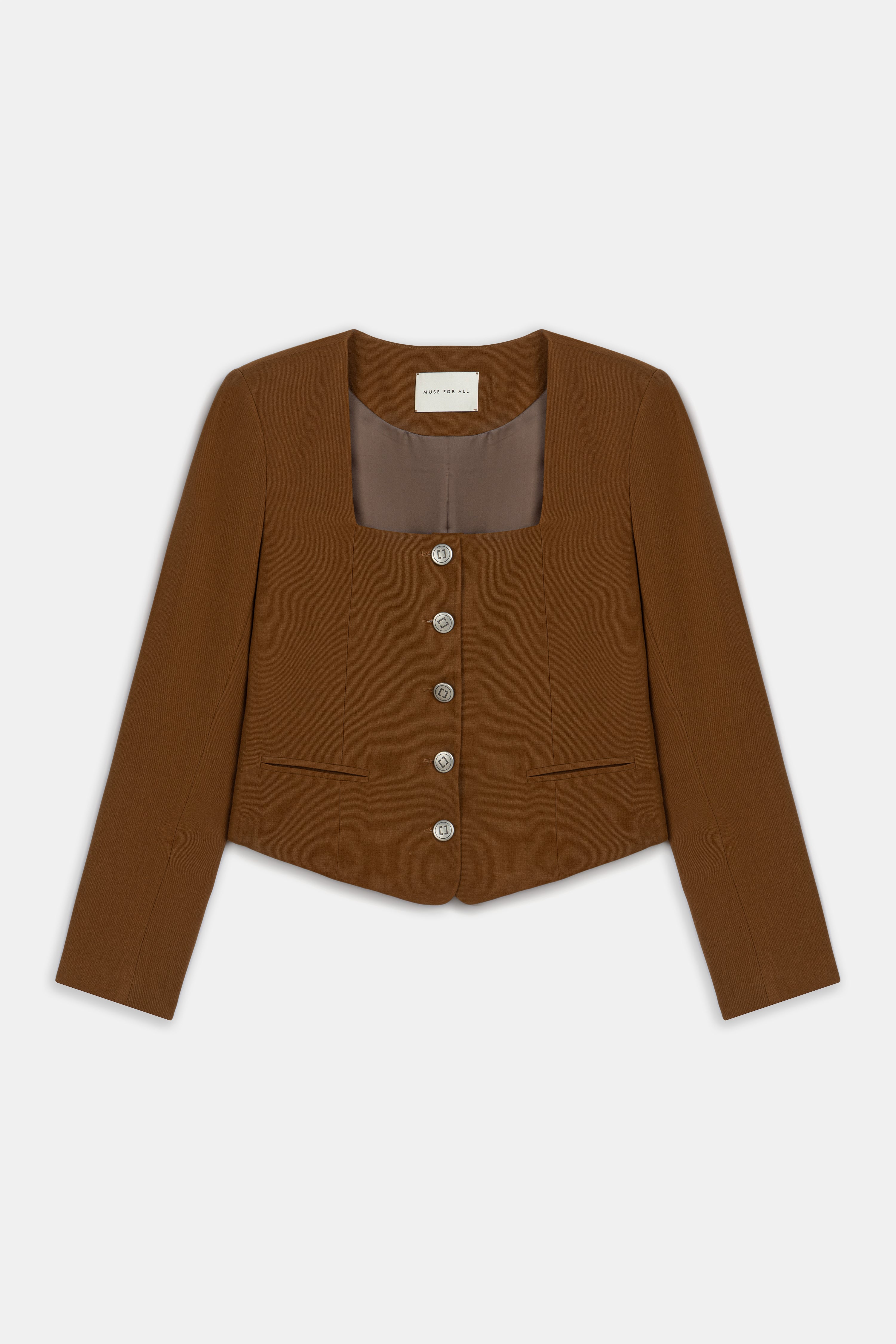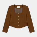 Square neck, short terracotta jacket with silver button details.