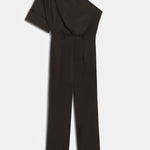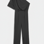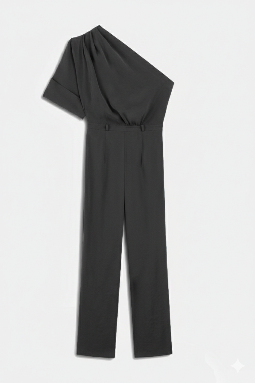 One-shoulder, draped elegant jumpsuit with wide legs.