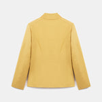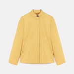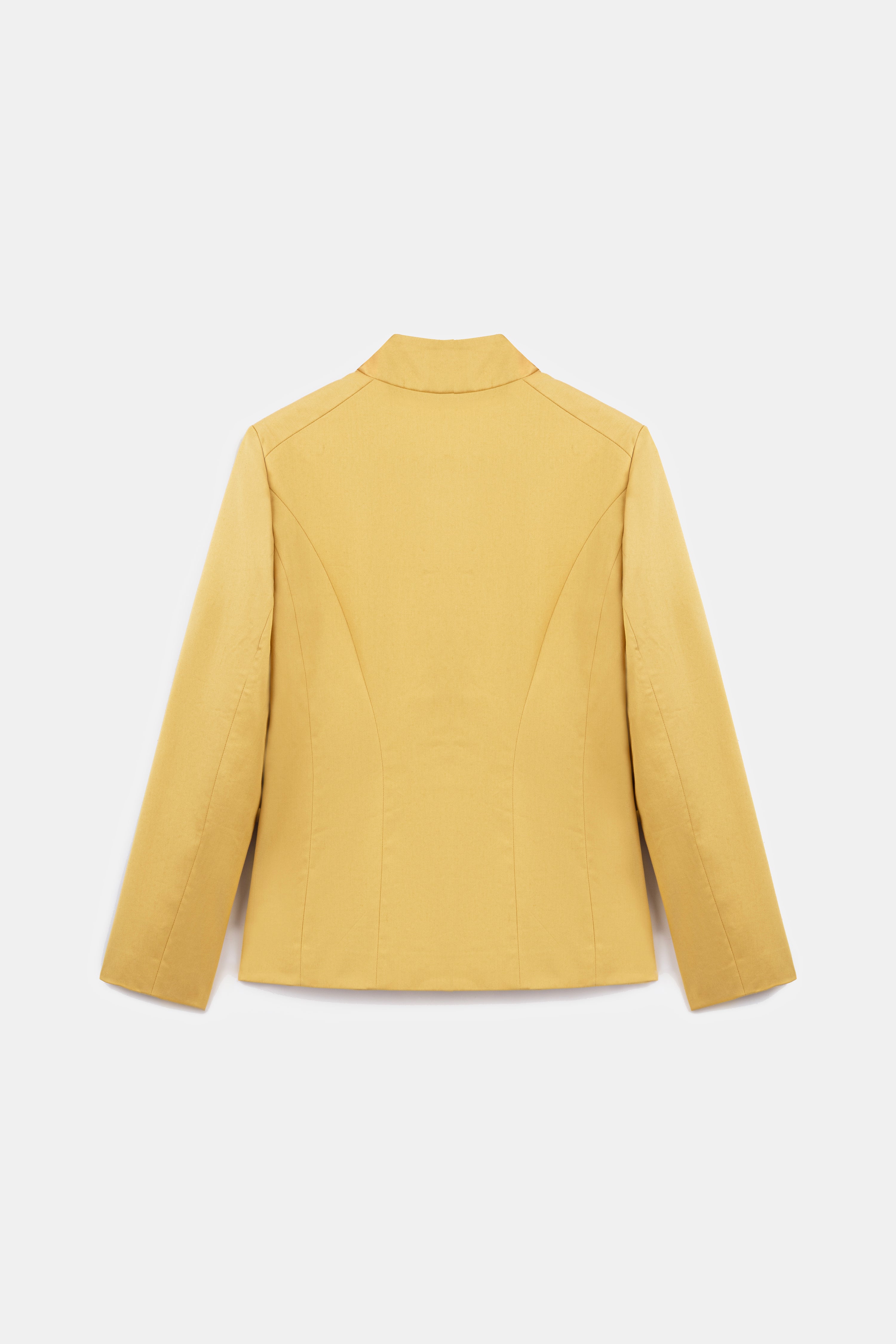 Mandarin collar, yellow jacket with a hidden placket and dart details.