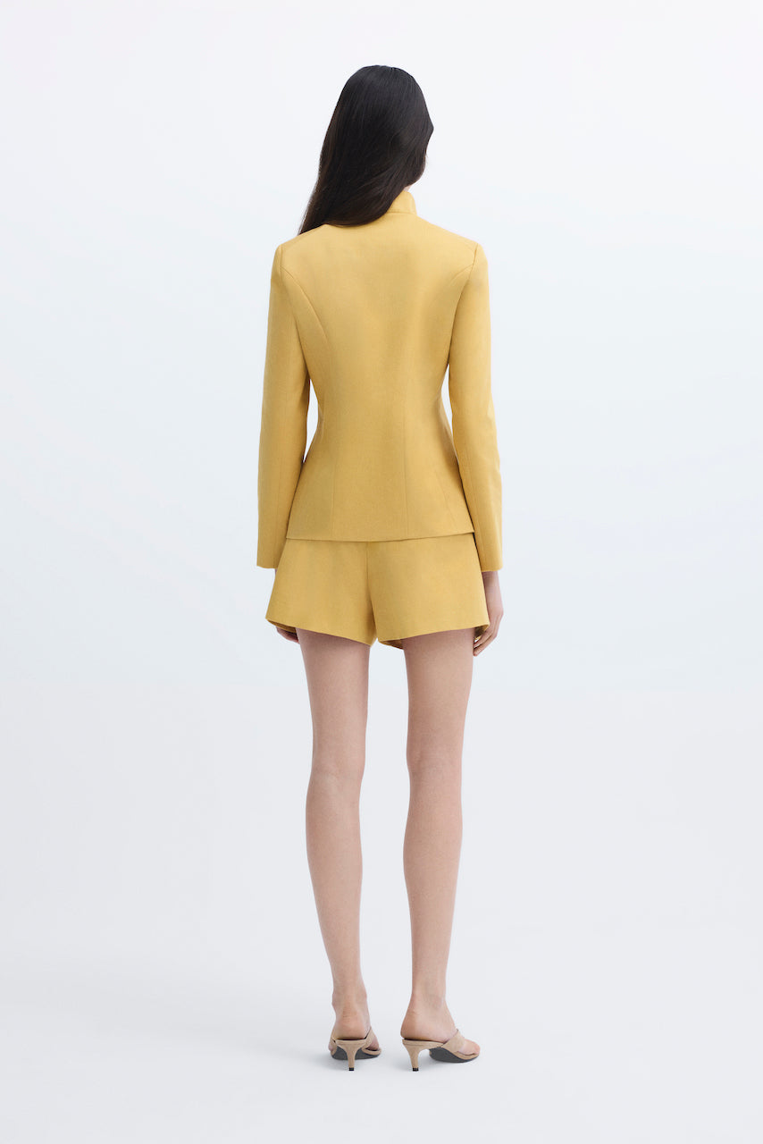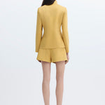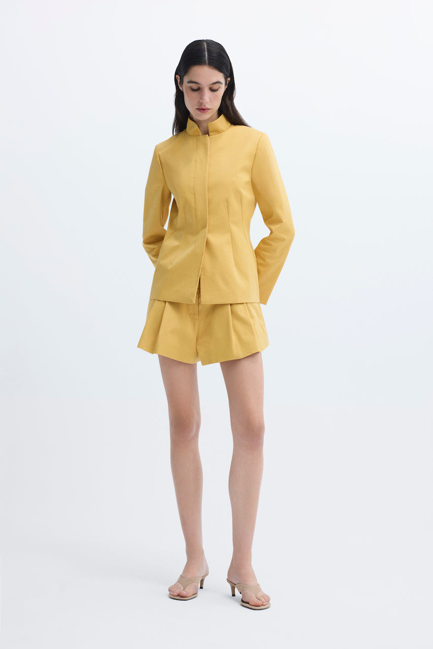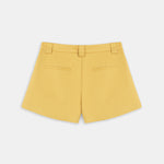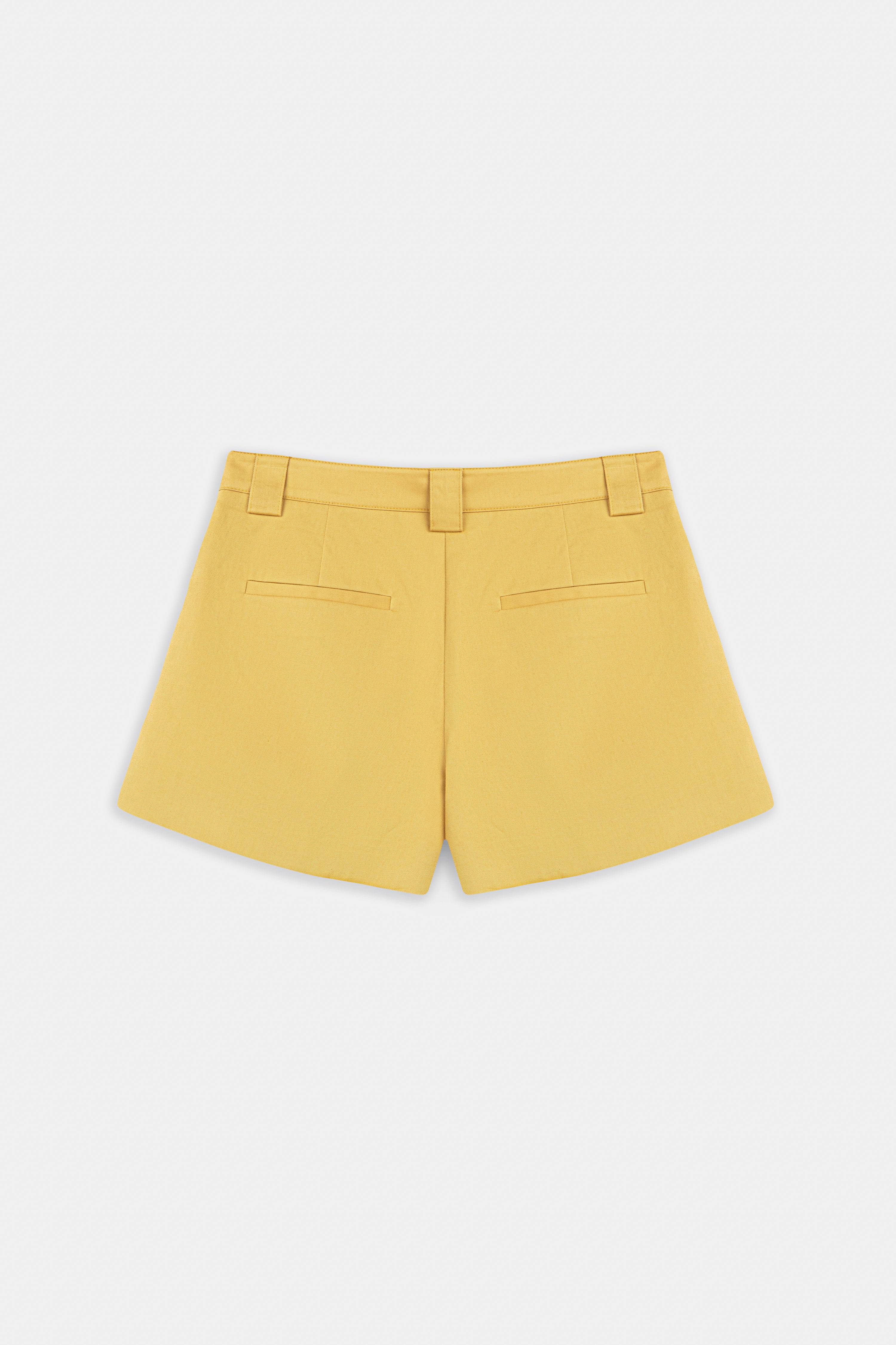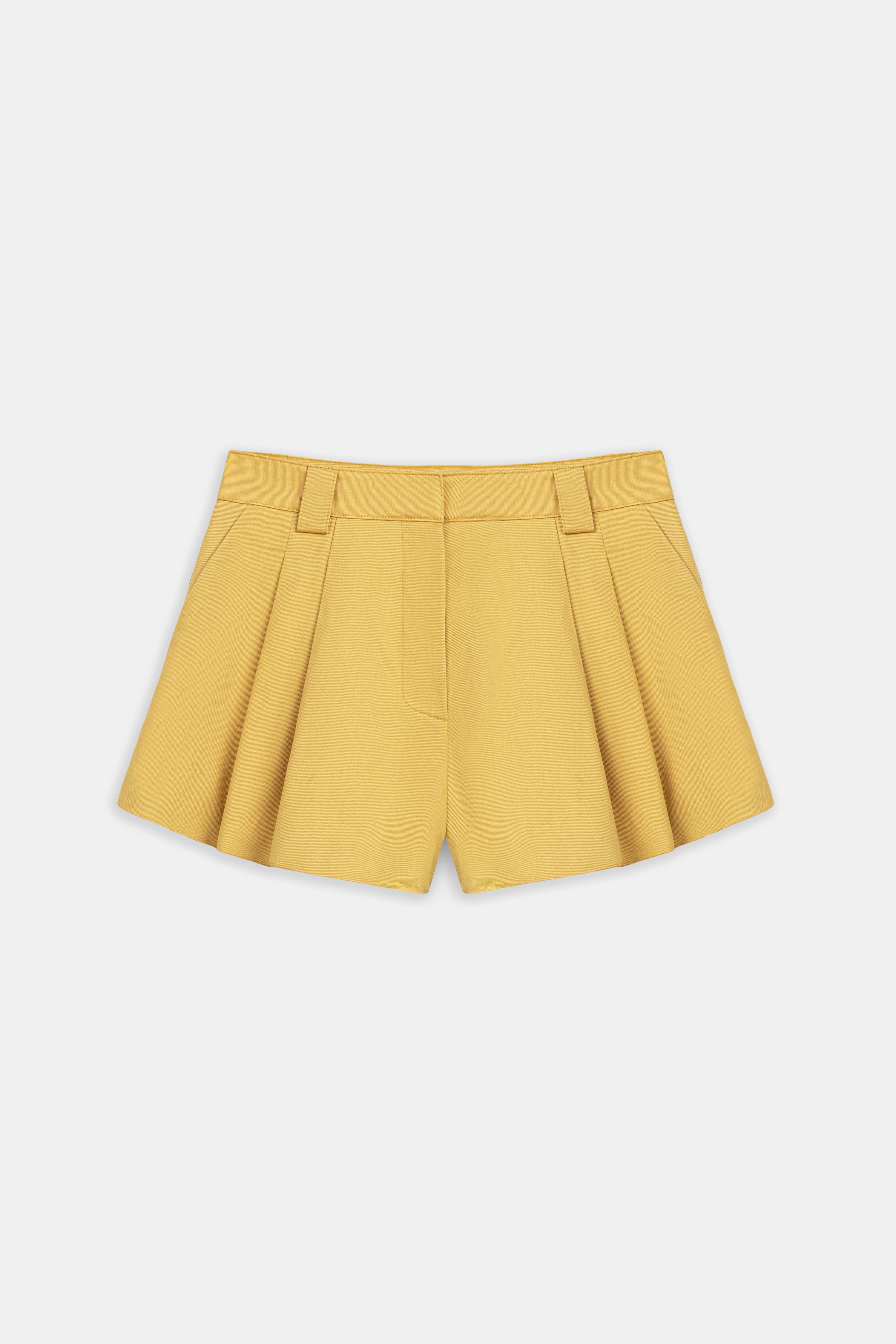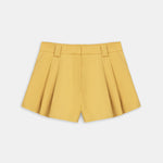 High-waisted, wide-leg pleated yellow shorts.