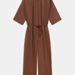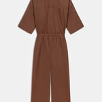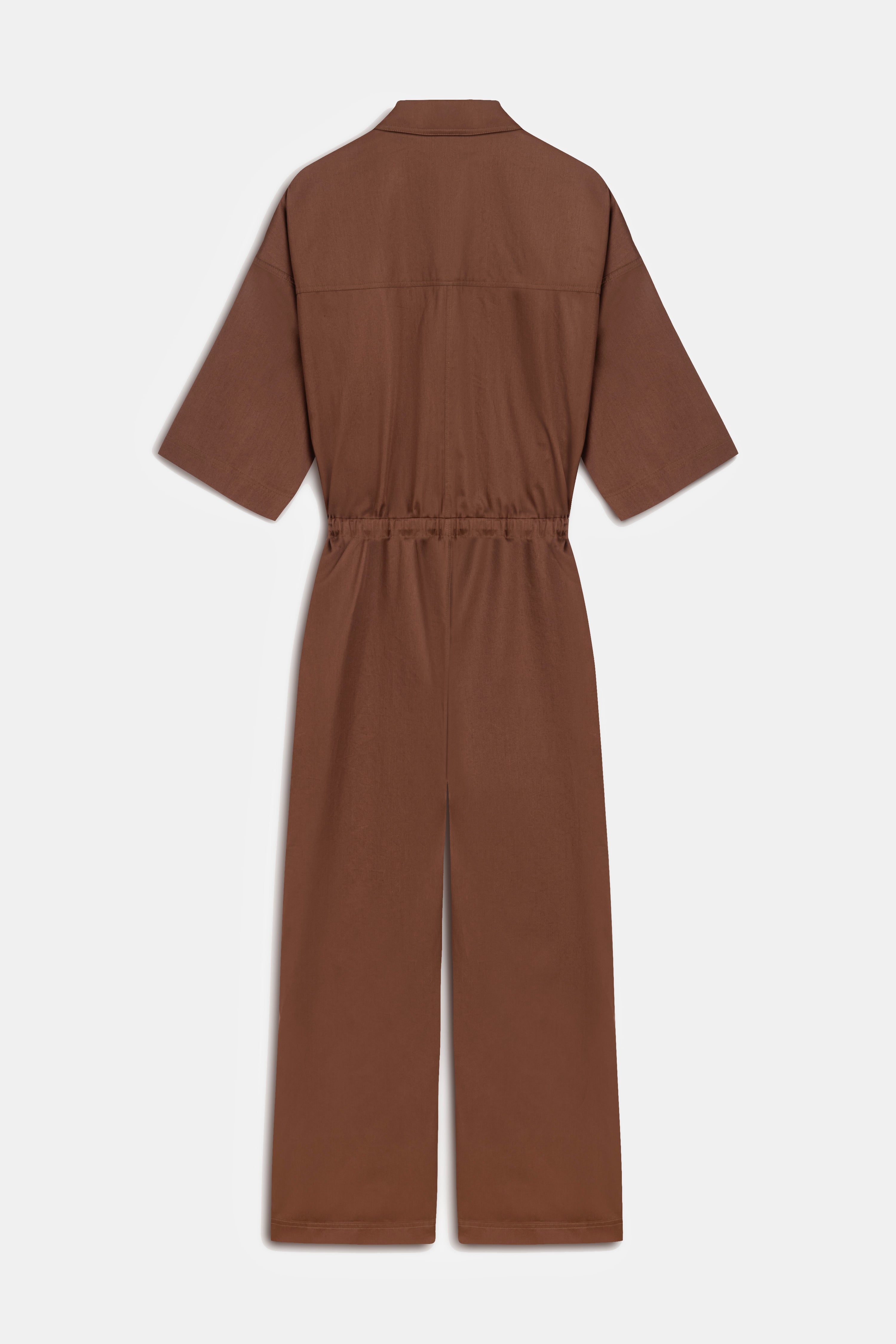 Düğmeli kapama detaylı, kısa kollu, yakalı ve düz paçalı pamuk tulum.