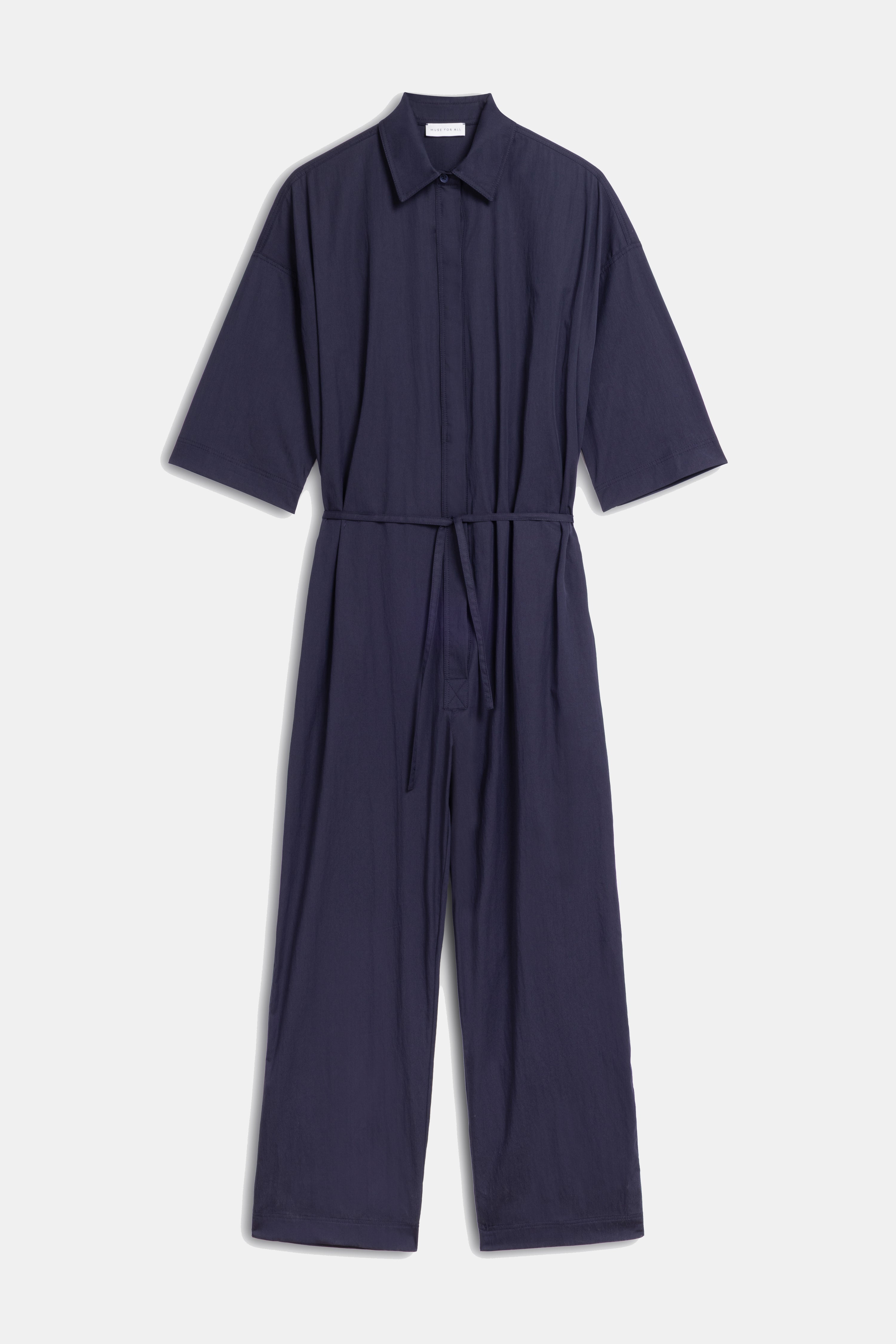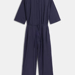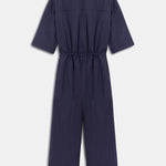 Düğmeli kapama detaylı, kısa kollu, yakalı ve düz paçalı tulum.