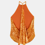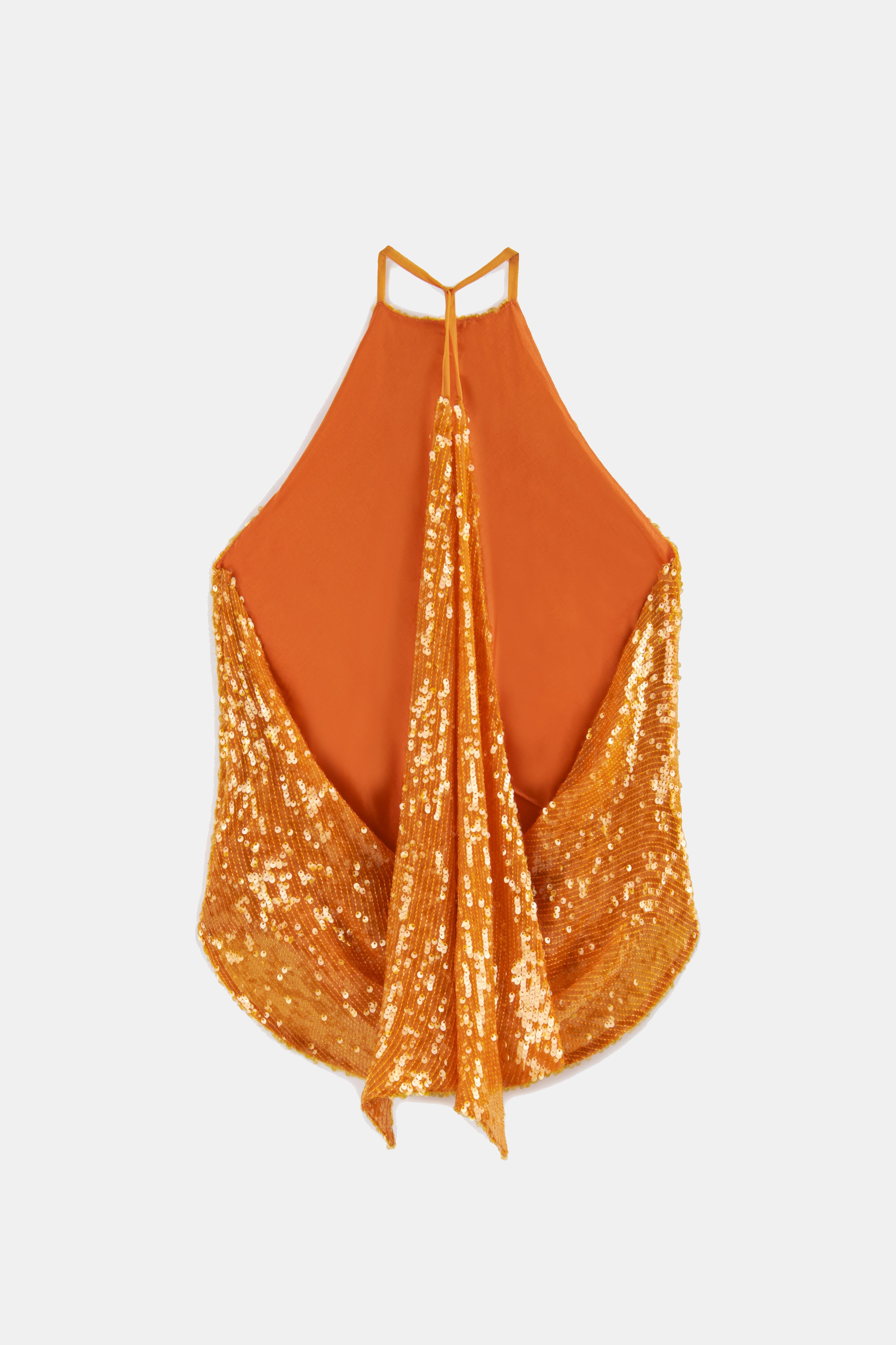 Payet işlemeli, halter yaka, drape sırt detaylı parlak bluz
