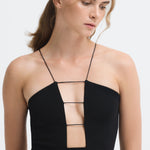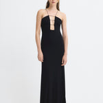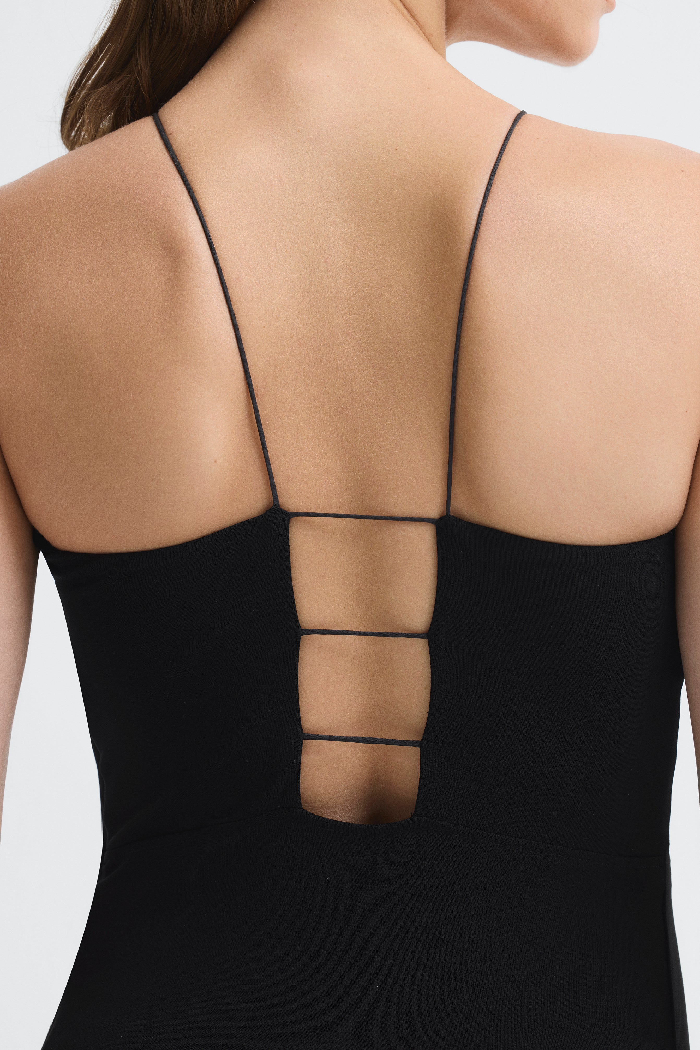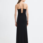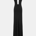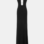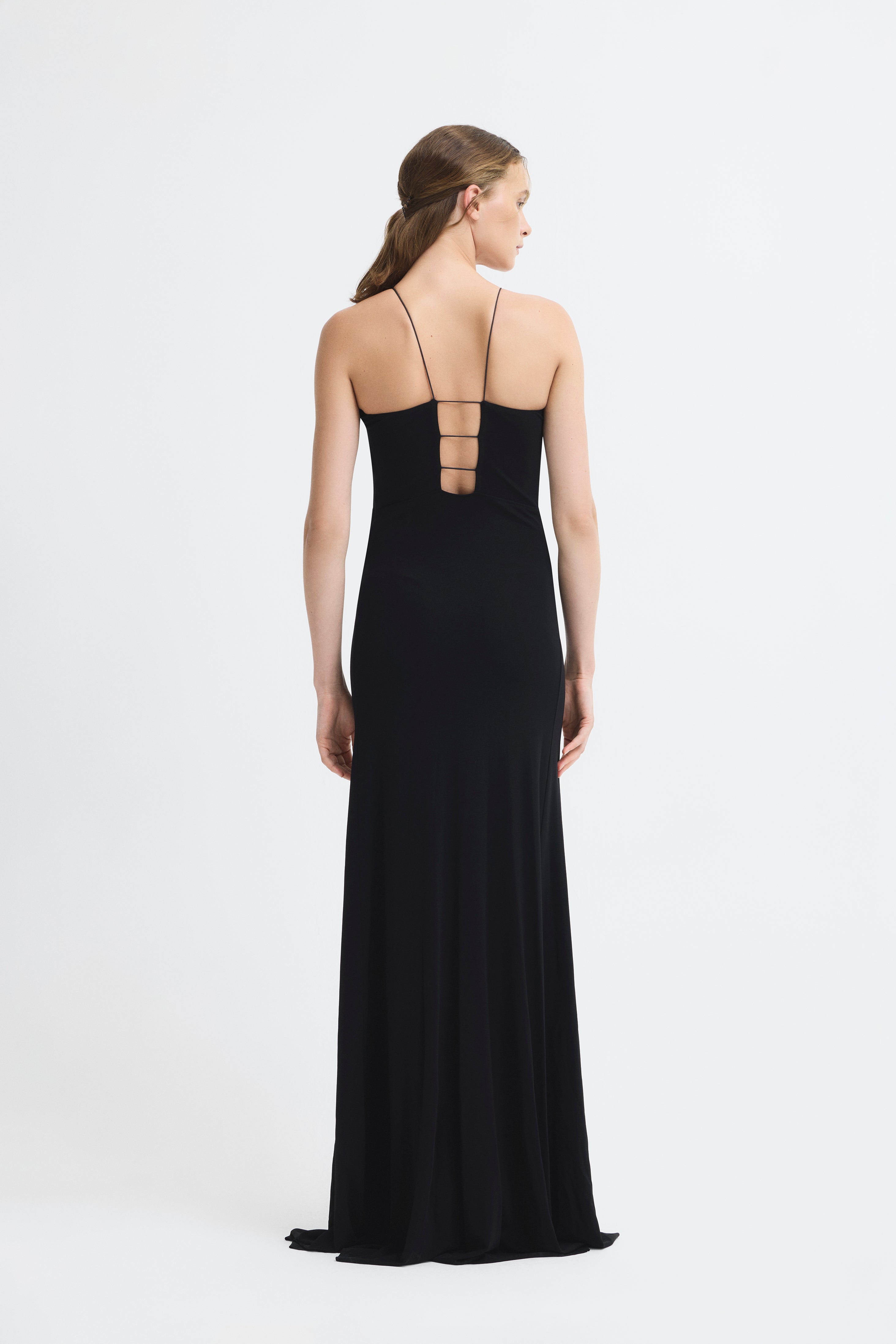 İnce askılı ve derin yaka detaylı uzun elbise.