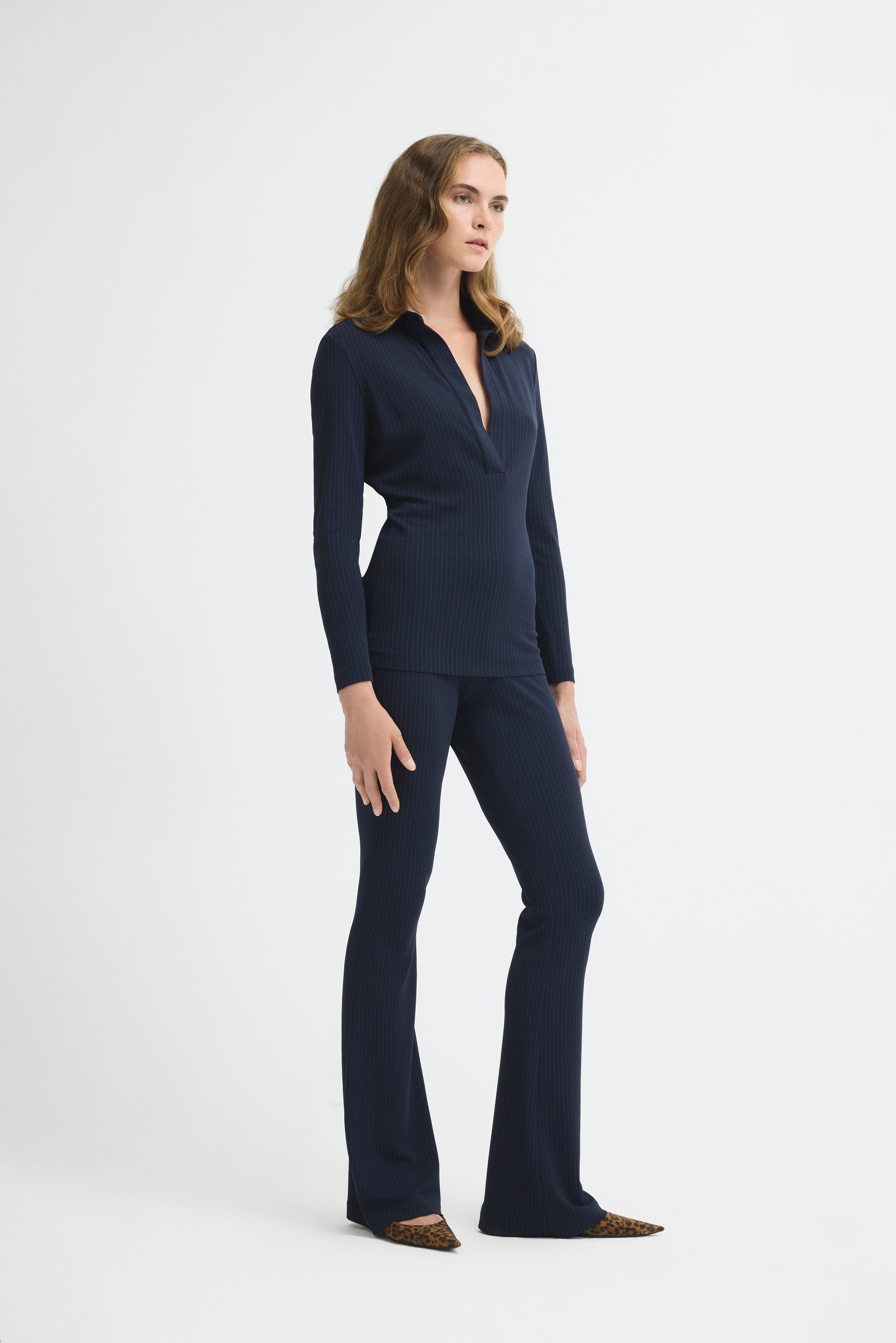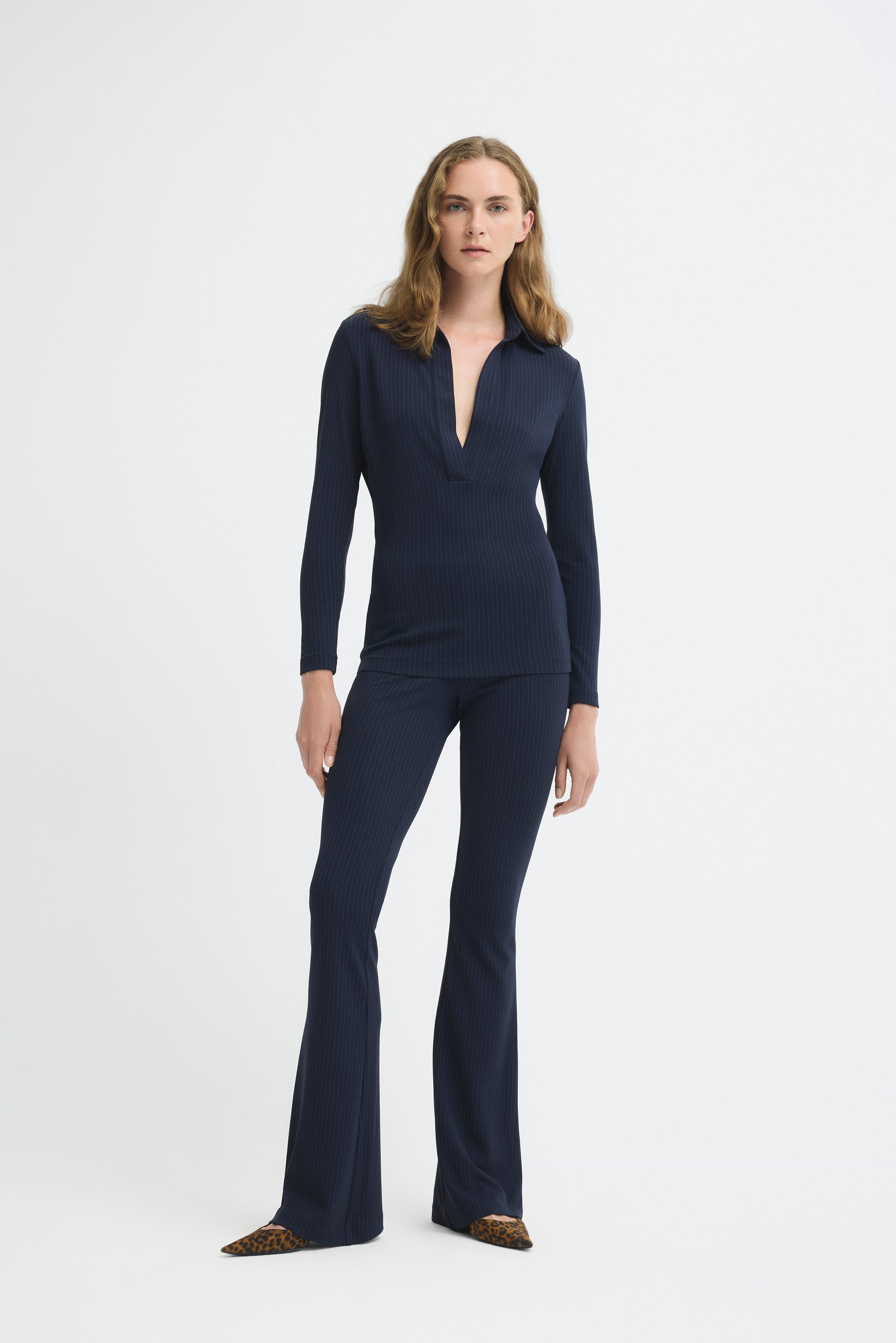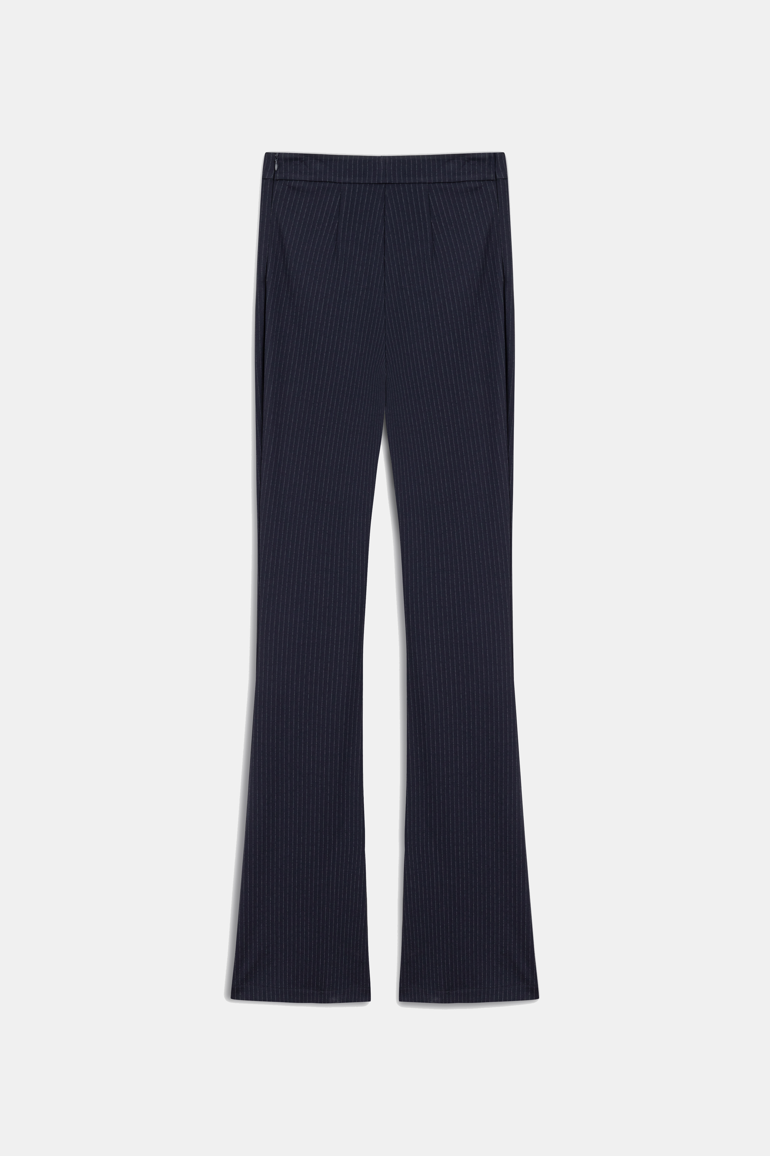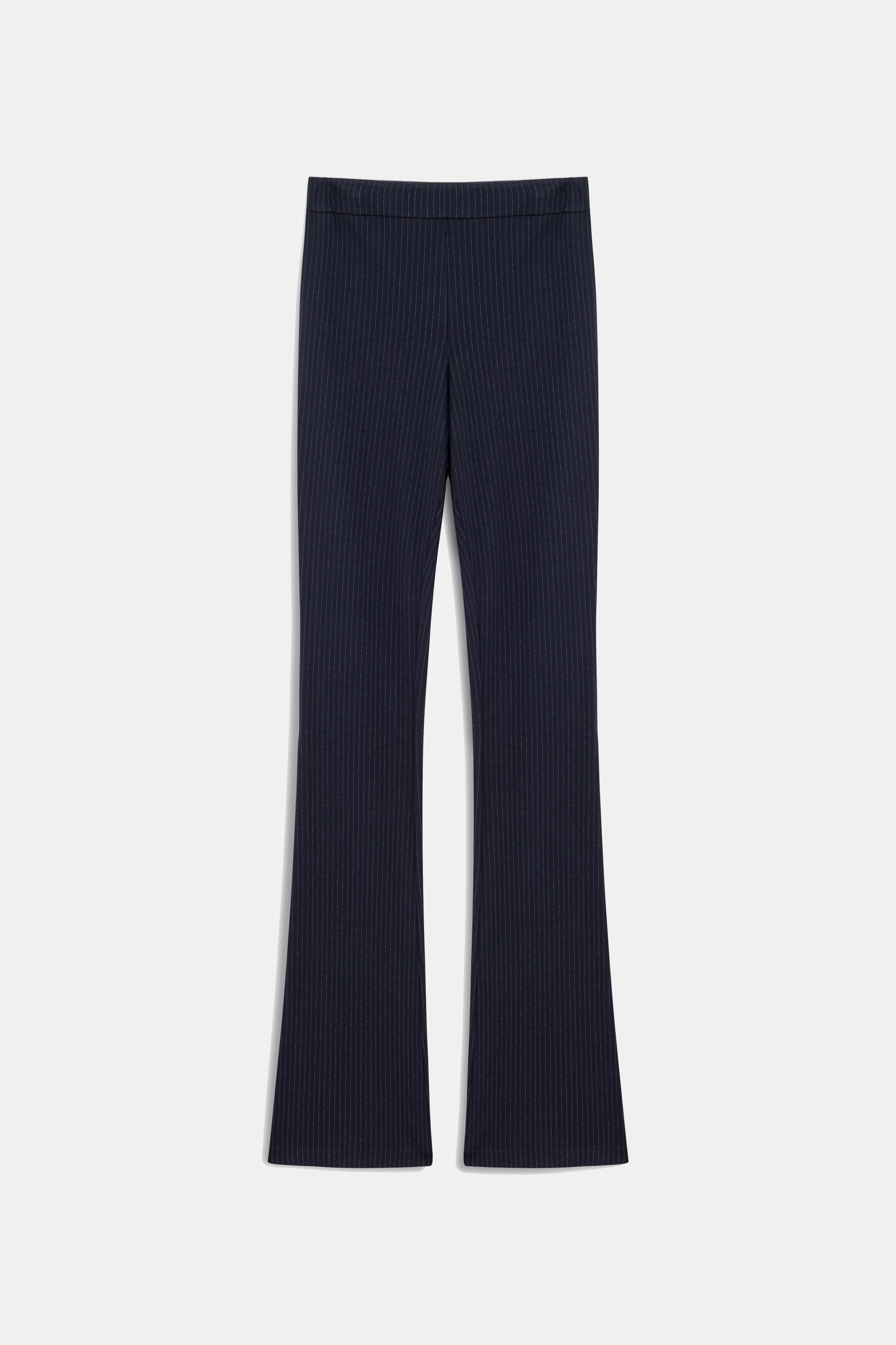 Yüksek bel, çizgili, geniş paçalı pantolon.